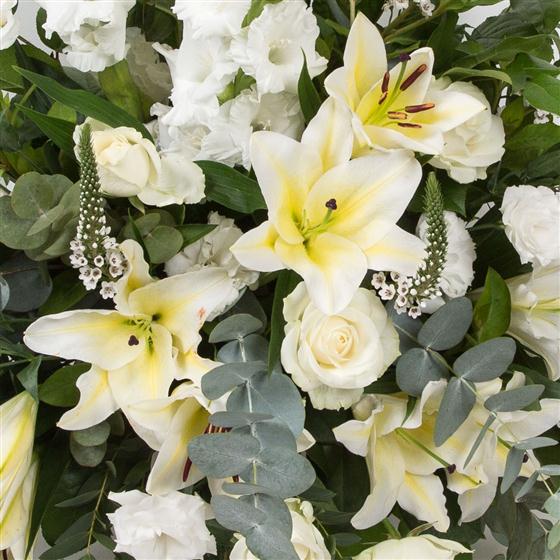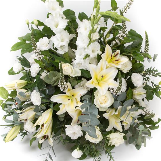 An all white front facing arrangement including scented oriental lilies, roses and gladioli.