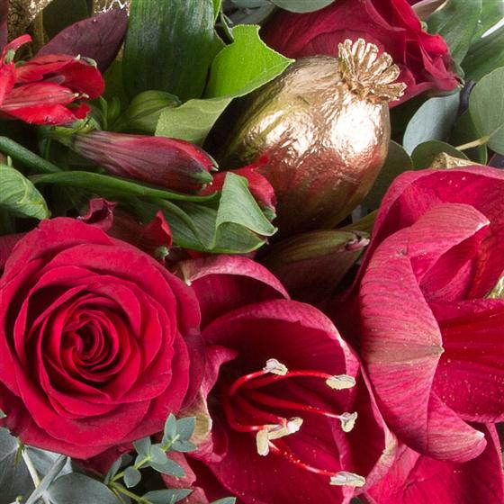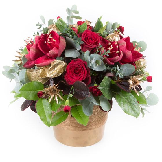 This beautiful arrangement includes amaryllis, long stemmed and spray red roses with a selection of seasonal foliage. Cones and silver clusters give this arrangement a stylish festive feel.