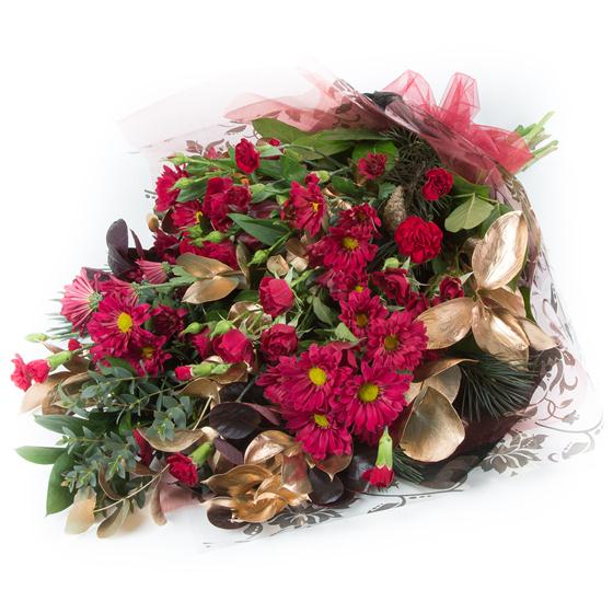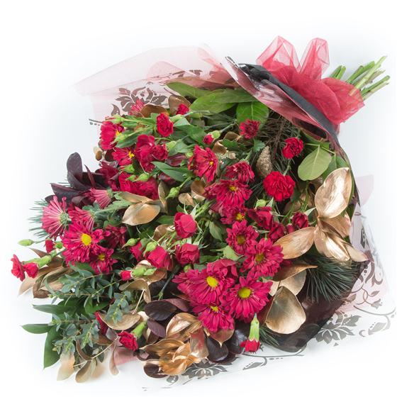 A lovely mix of deep, rich reds blooms and seasonal foliage. This traditional style bouquet is simply wrapped to enable the recipient to arrange their gift as they wish.