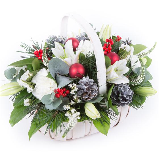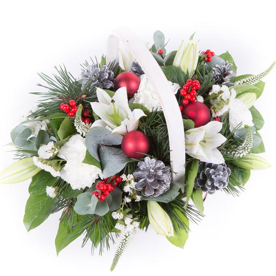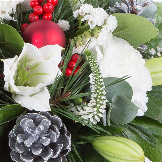 Packed full of seasonal foliage and created using festive fresh Flowers. Perfect christmas gift.
