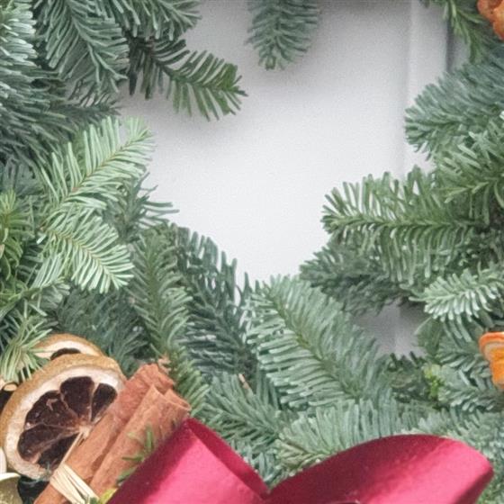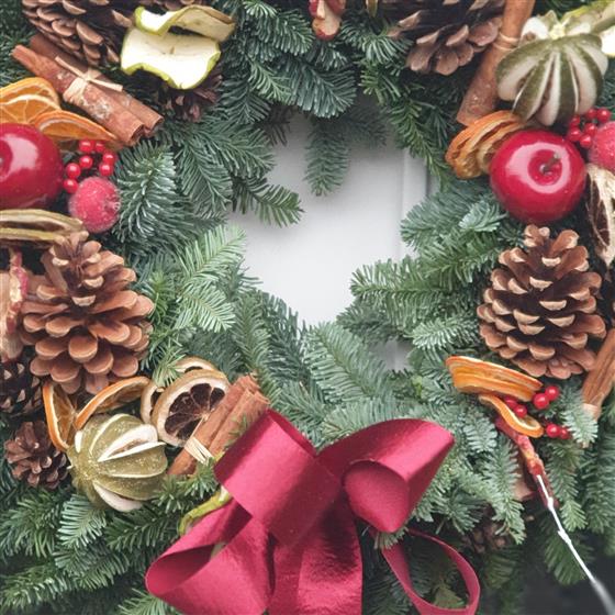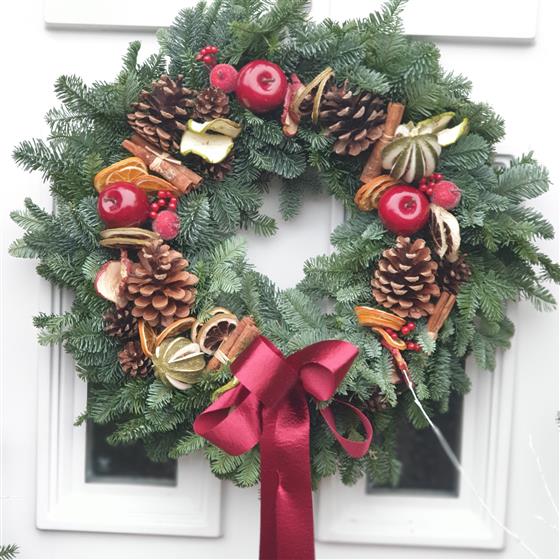 This traditional festive door wreath is handmade and decorated with fruits and cones perfect reflection of the season.